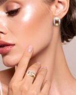 Wyjątkowo oryginalne kolczyki, intrygują regularną kompozycją kunsztownie ozdobioną lśnieniem drobnych cyrkonii.