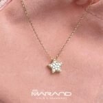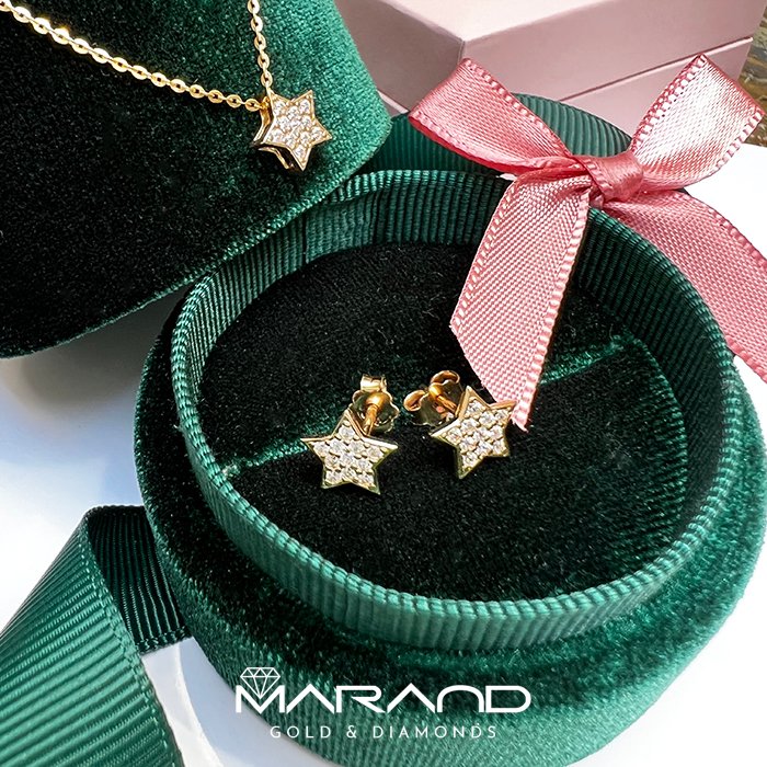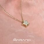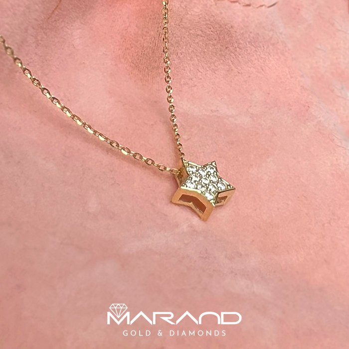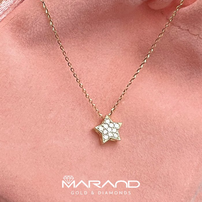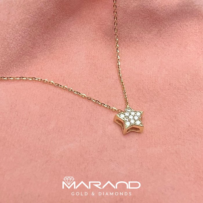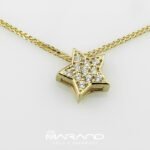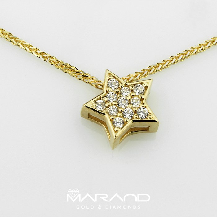 Złota zawieszka w kształcie gwiazdy, wykonana z żółtego złota pr. 585, wysadzana cyrkoniami.