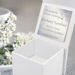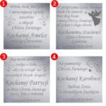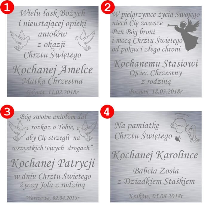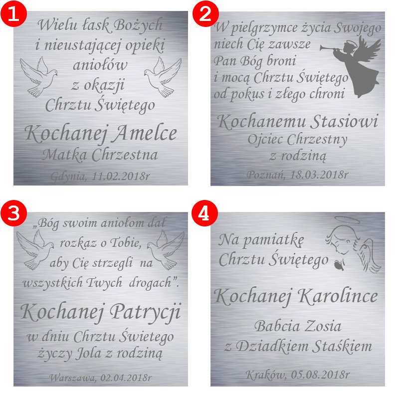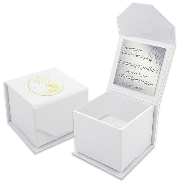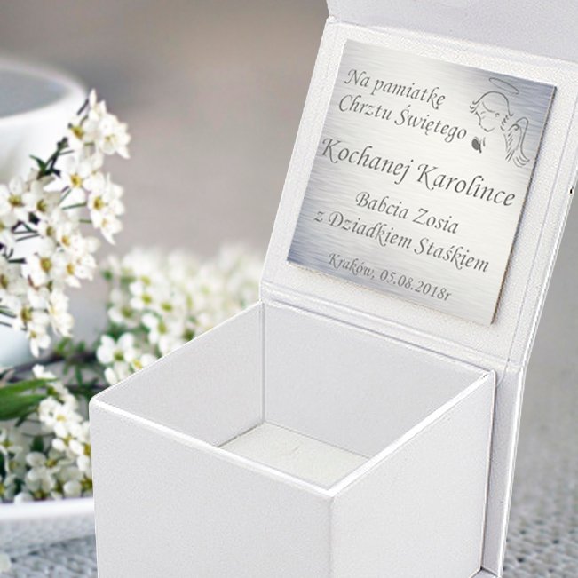 Pudełko na chrzest. Spersonalizowane pudełeczko uczyni Twój prezent jeszcze bardziej wyjątkowym i niezapomnianym. Na estetycznej tabliczce o strukturze stali szczotkowanej o wymiarach 37 x 37 mm wygrawerujemy GRATIS Twoją dedykację do ok 160 znaków ze spacjami. Grawerunek wykonujemy maszynowo i precyzyjnie ostrzem diamentowym, co daje gwarancję jakości i trwałości dedykacji. Nasza technologia jest estetyczna i bardzo trwała. Skorzystaj z naszych propozycji i wybierz jeden z prezentowanych wzorów dedykacji lub padaj nam własną treść grawerunku.
