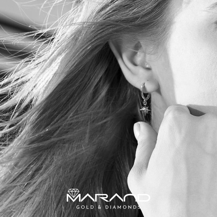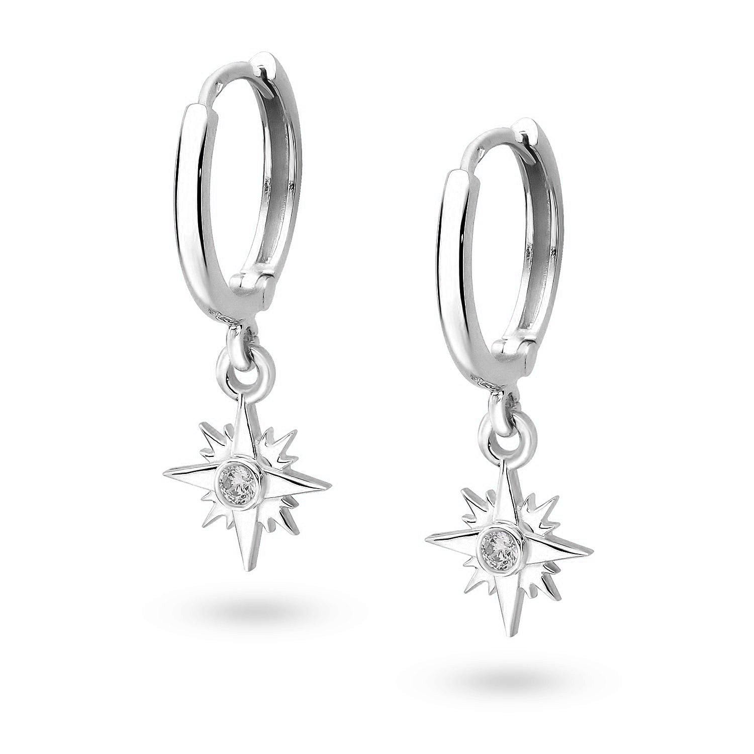 Srebrne kolczyki koła z wiszącą gwiazdą. Róża wiatrów zawieszona na srebrnych obręczach. Modny dodatek codziennej stylizacji.