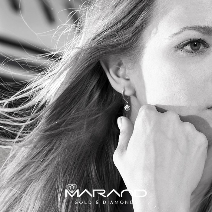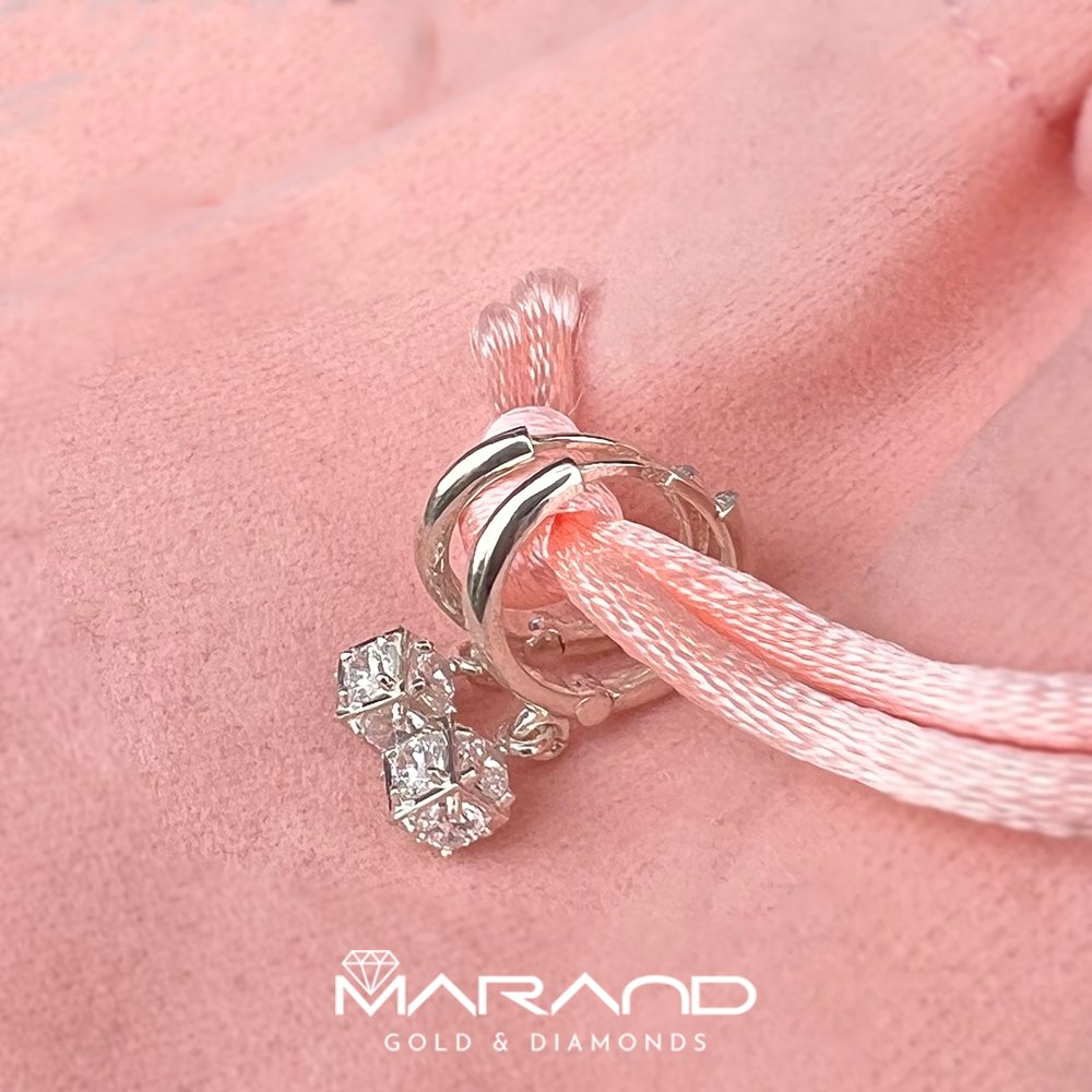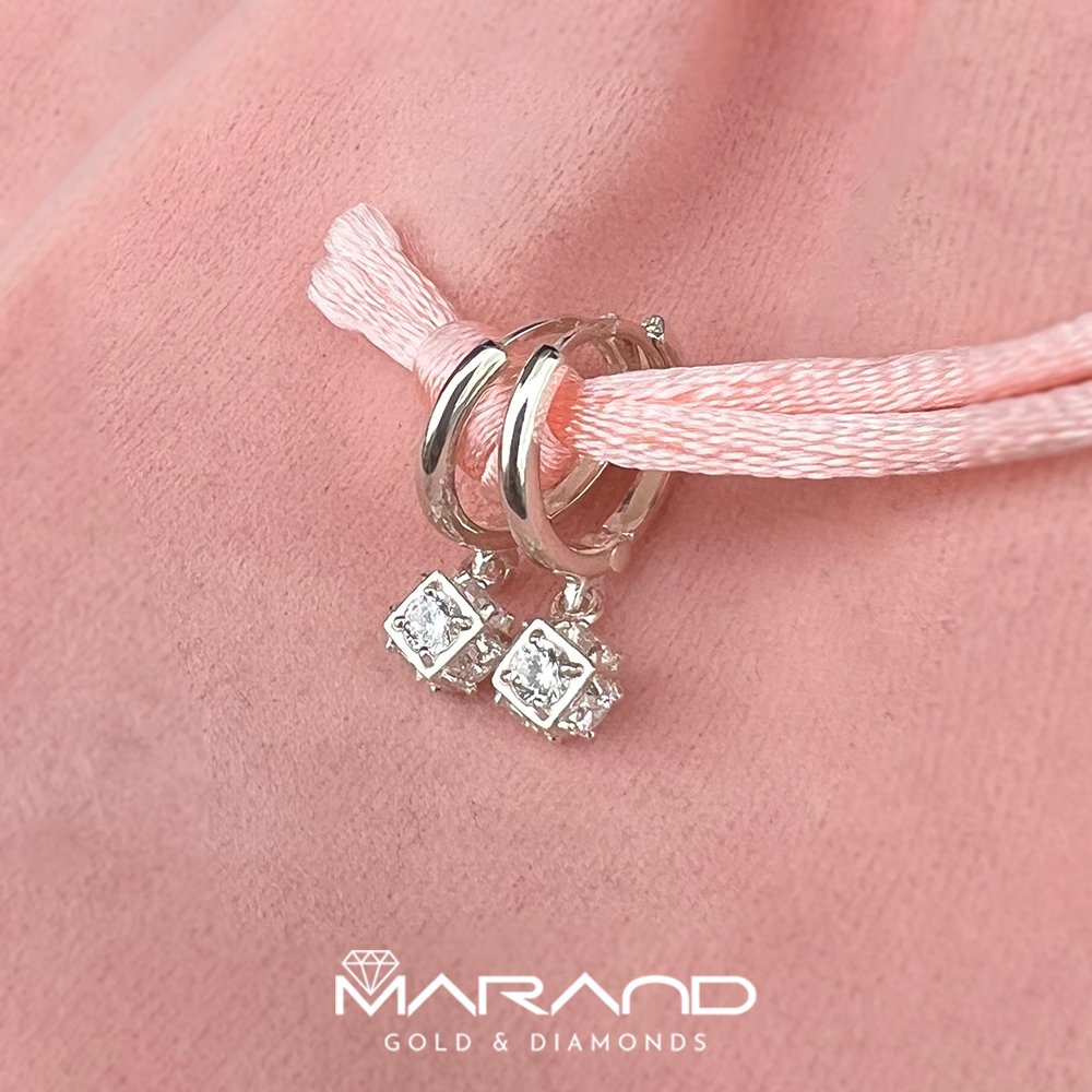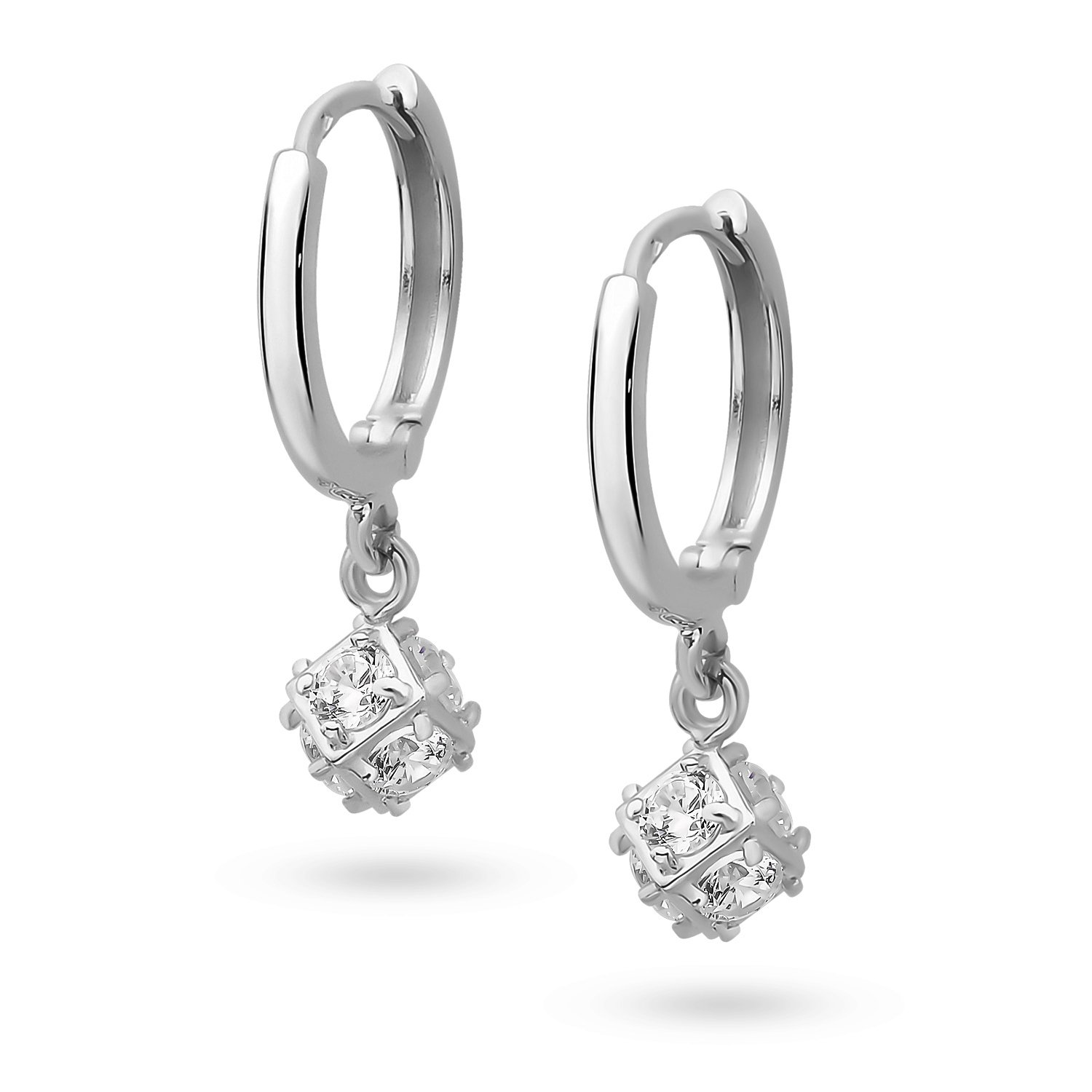 Srebrne kolczyki wiszące kostki z cyrkoniami. Delikatne, klasyczne koła ozdobione zostały subtelnymi zawieszkami w formie przestrzennych kosteczek wysadzanych błyszczącymi cyrkoniami.
