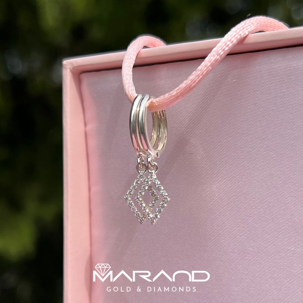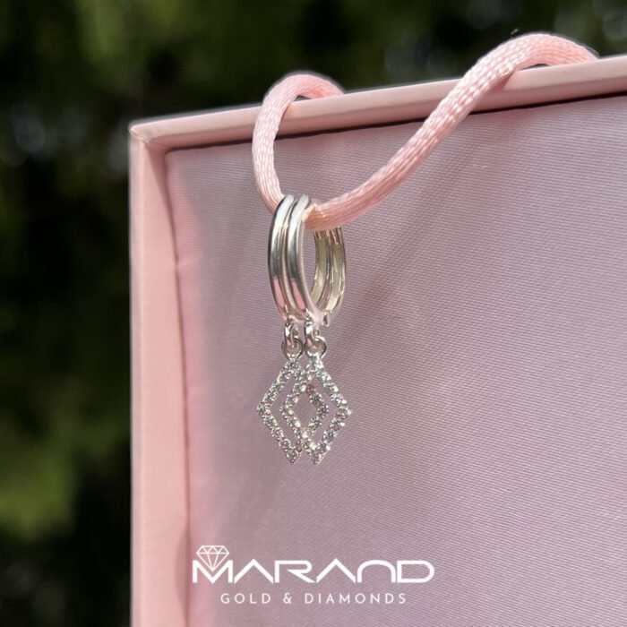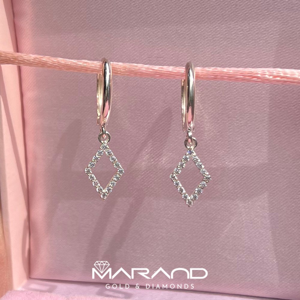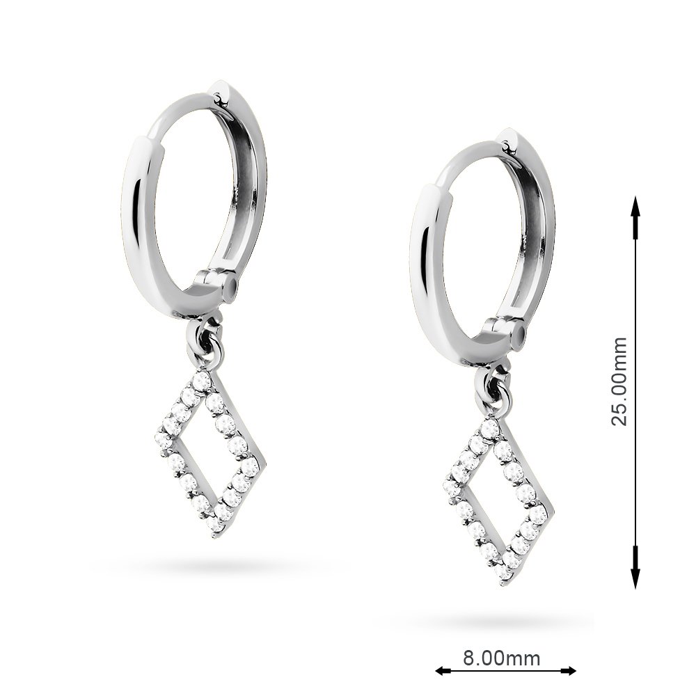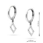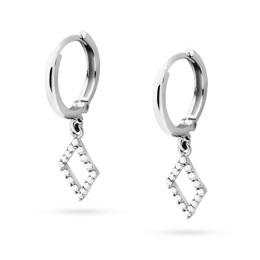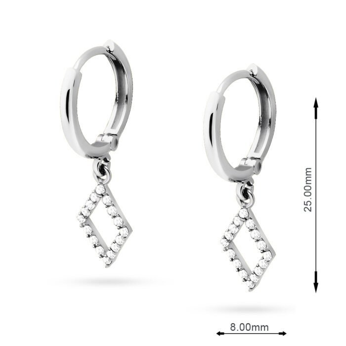 Srebrne kolczyki wykonane z najwyższej jakości srebra próby 925. Delikatne kółka zostały ozdobione efektowną zawieszką w kształcie rombu, wysadzaną cyrkoniami, które dodają subtelnego blasku każdej stylizacji.