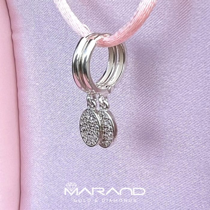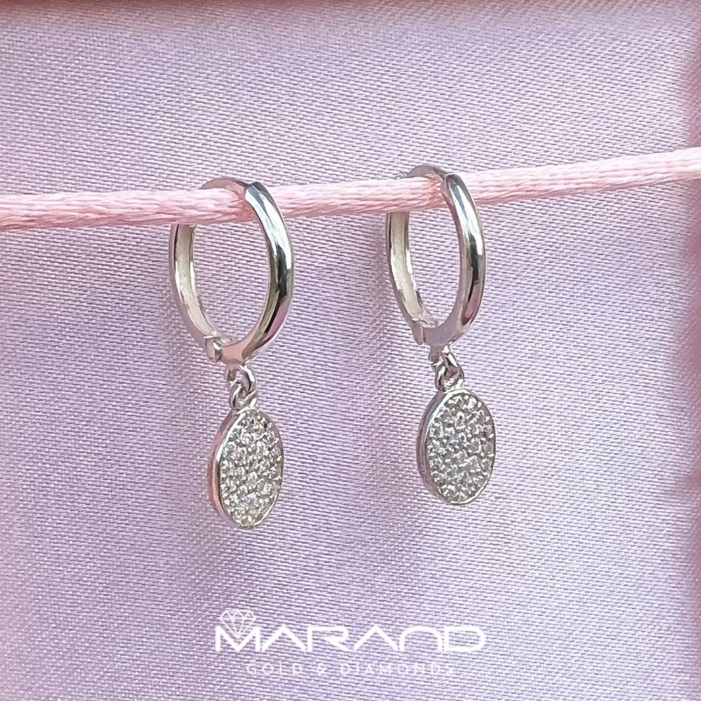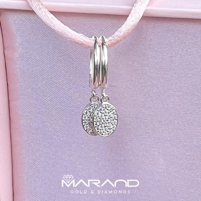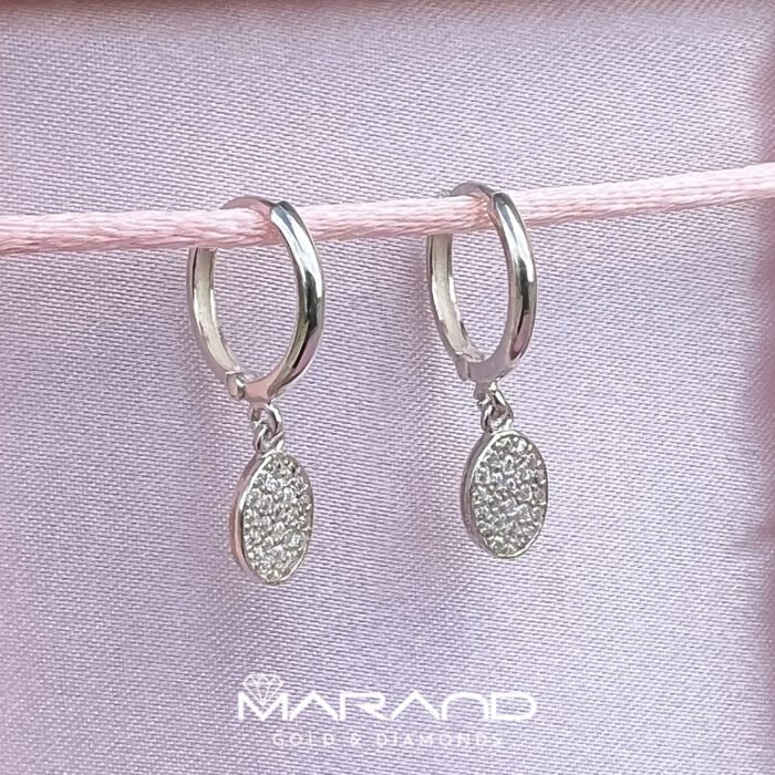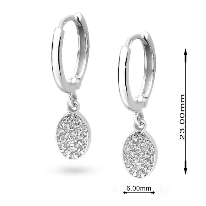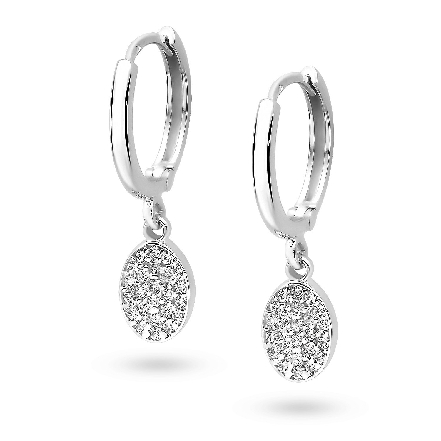 Srebrne kolczyki wiszące z cyrkoniami. Prosta owalna forma migoczących oprawionych blisko siebie cyrkonii. Kompozycja wykonana ze srebra próby 925 z wykończeniem w wysokim połysku. Klasyczna propozycja w nowoczesnym wydaniu.