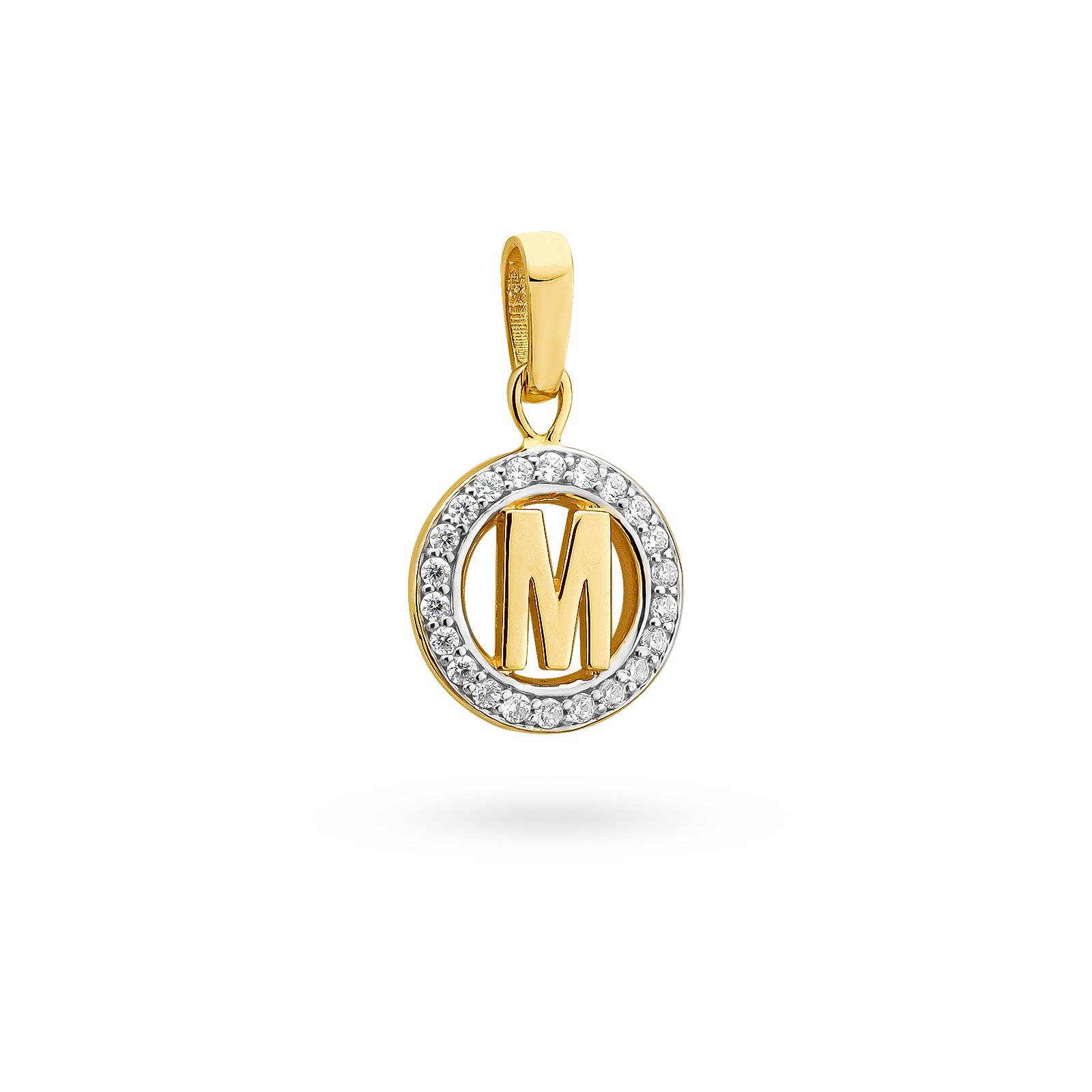 Złota zawieszka literka M z cyrkoniami. Kółeczko ażurowe, połyskujące subtelnym blaskiem cyrkonii i M