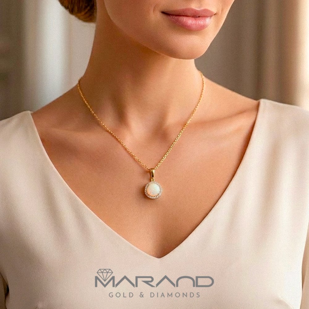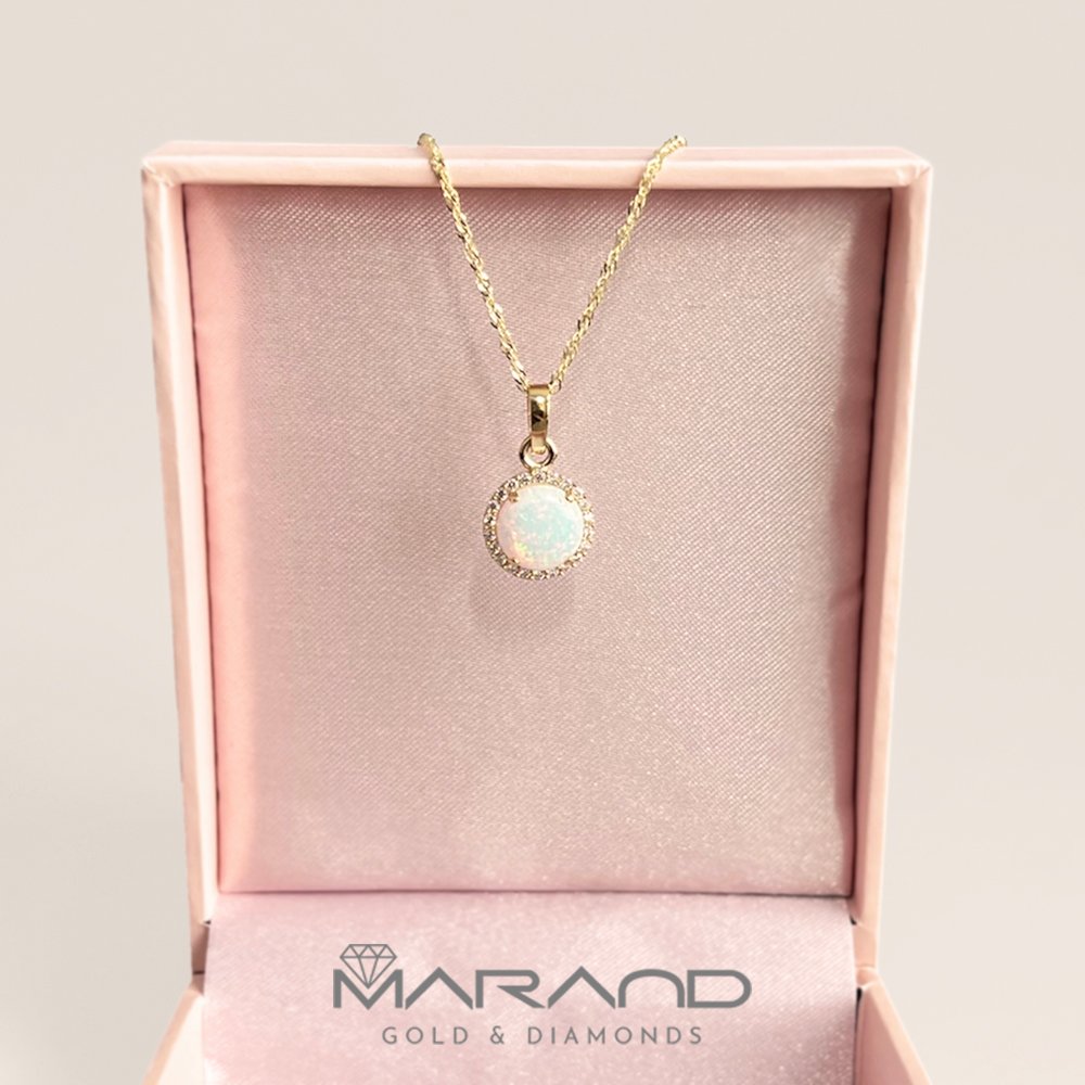 Złota zawieszka z okrągłym opalem i cyrkoniami Swarovski. Wykonane z najwyższej jakości żółtego złota próby 333 (8K).