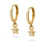 Złote kolczyki koła z wiszącym elementem w kształcie gwiazdki. Modne kolczyki złote gwiazdki zawieszone na złotych obręczach. Doskonały prezent na każdą okazję.