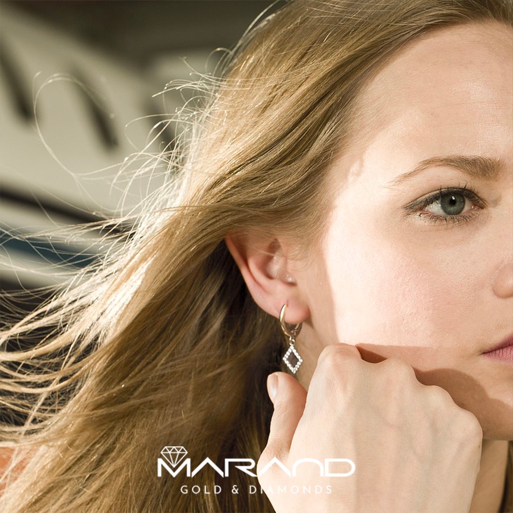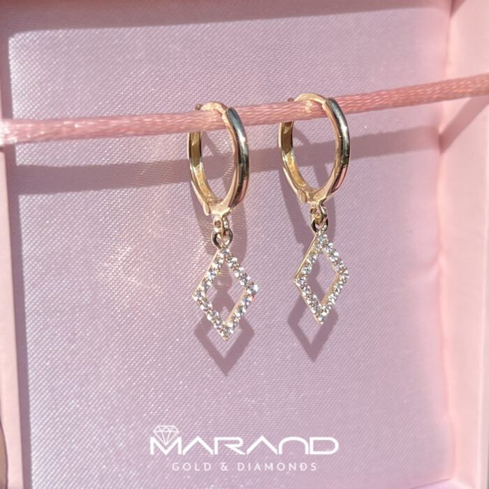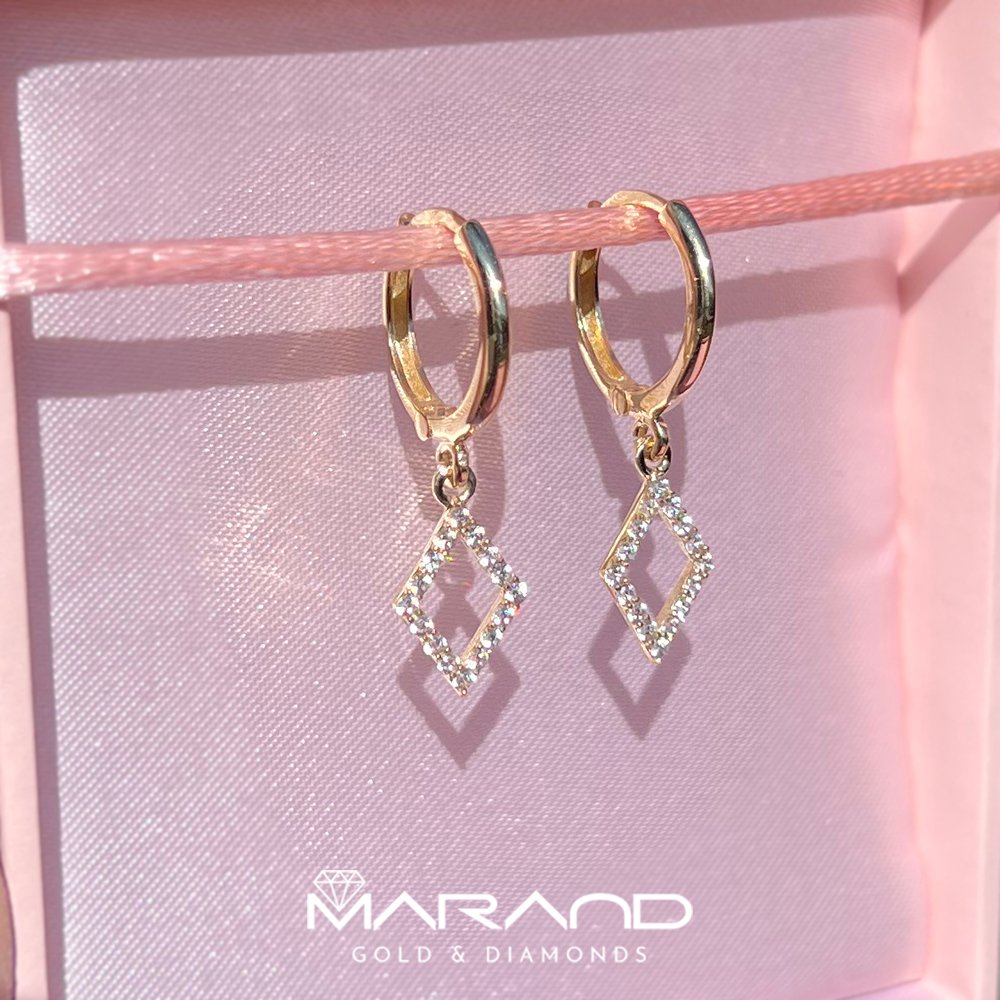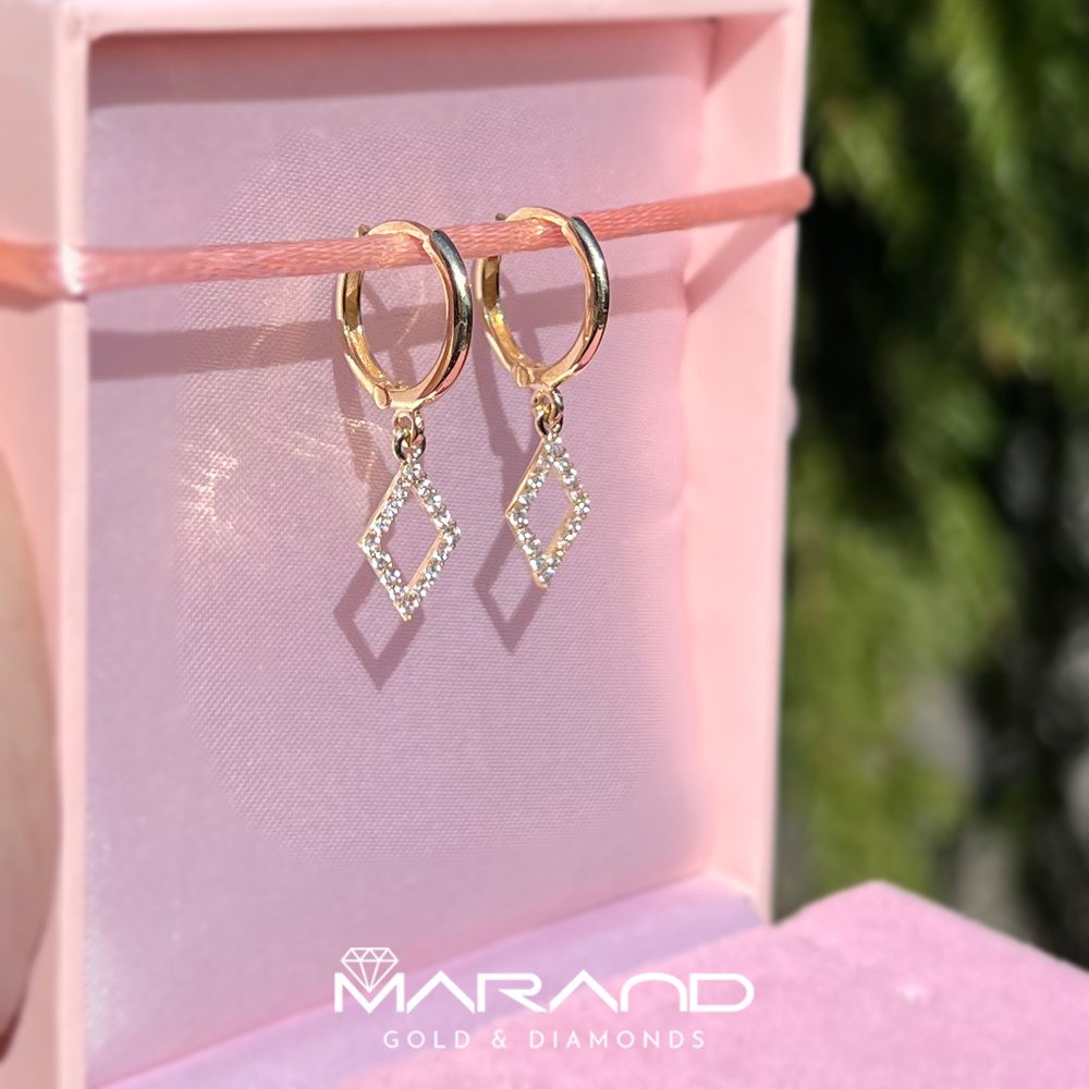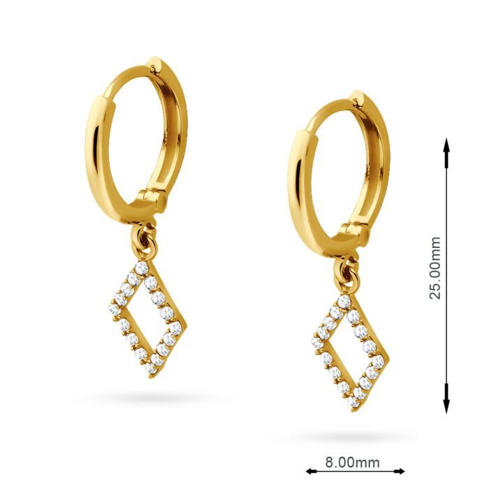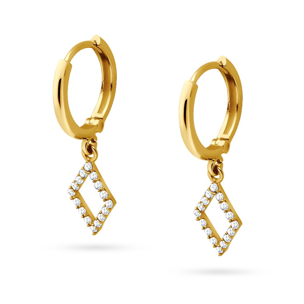 Złote kolczyki wykonane z najwyższej jakości żółtego złota próby 333. Delikatne kółka zostały ozdobione efektowną zawieszką w kształcie rombu, wysadzaną cyrkoniami, które dodają subtelnego blasku każdej stylizacji.