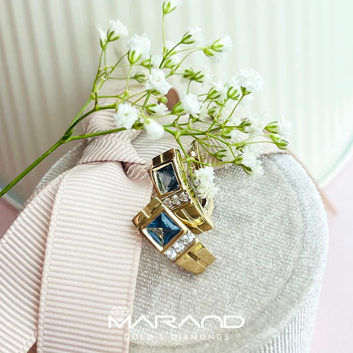 Eleganckie i nowoczesne złote kolczyki z kwadratowym akwamarynem.