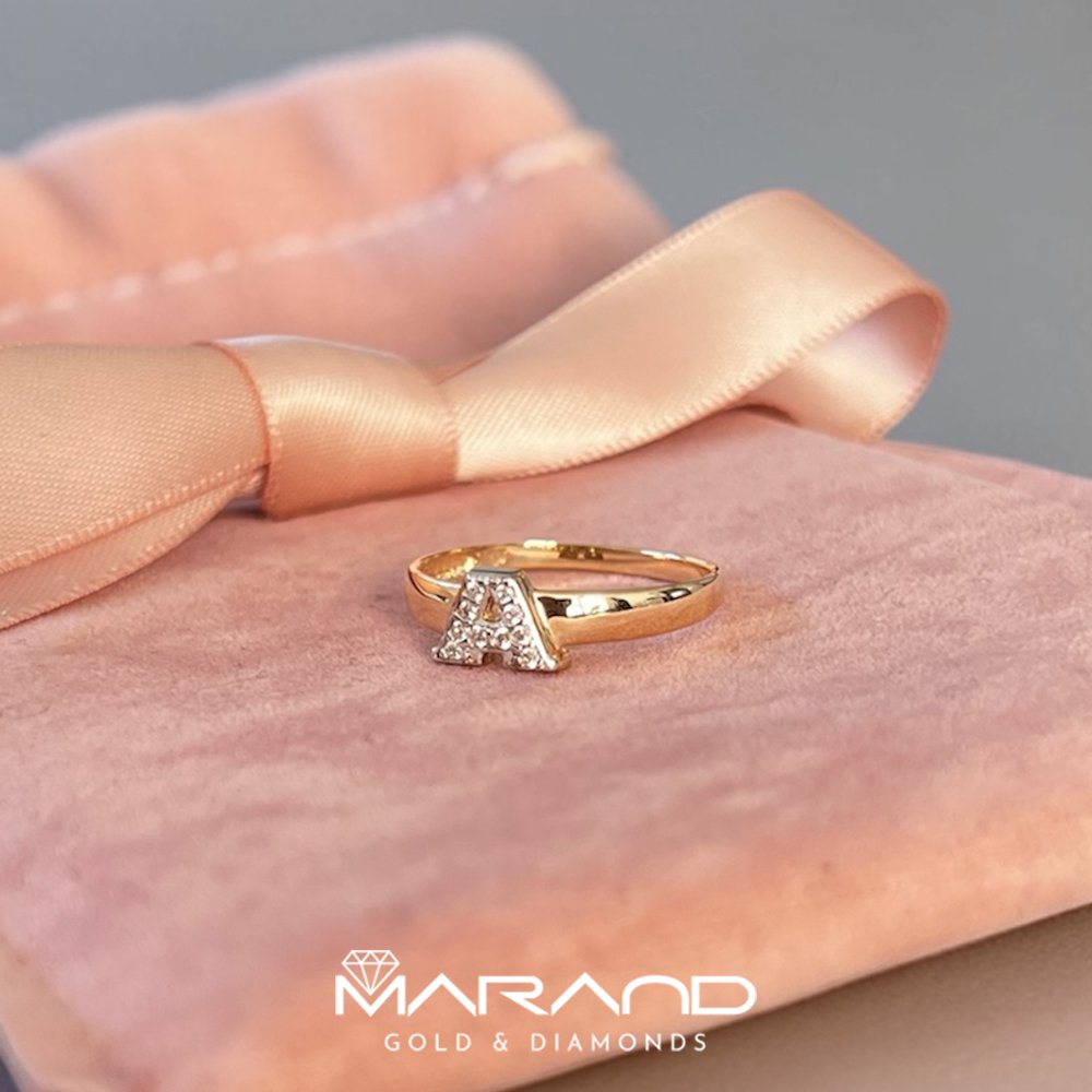 Unikatowy pierścionek z literką A wysadzaną cyrkoniami. Pierścionek wykonany z żółtego złota próby 333.