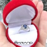 Elegancki złoty pierścionek z majestatycznym szafirem i brylantami, wykonany z 14-karatowego białego złota. Oko przyciąga duży, owalny, niebieski szafir otoczony brylantami. Królewski i romantyczny design, podkreślają dodatkowe brylanty oprawione w serca, łączące szynę pierścionka z kastem. Doskonały symbol zaręczyn, jak i prezent na każdą okazję. Wykonany z dbałością o najdrobniejszy szczegół. Wymiary: wysokość korony ok 5.0 mm. Do zakupu wystawiamy certyfikat kamieni szlachetnych.Masa pierścionka może się różnić w zależności od wybranego rozmiaru.