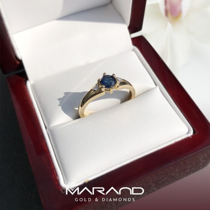 Elegancki i nowoczesny złoty pierścionek z szafirem i cyrkoniami.