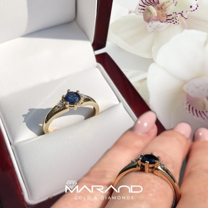 Elegancki i nowoczesny złoty pierścionek z szafirem i cyrkoniami, wykonany z żółtego złota pr. 585. Kamień centralny oprawiono w sześcioramienną nowoczesną koronę idealnie podkreślającą jego blask, dodatkowo z obydwu stron umieszczono dwa mniejsze kamienie wzbogacające kompozycję. Piękno i harmonia proporcji. Wyjątkowy symbol zaręczyn jak i upominek na każdą okazję. Przybliżone wymiary: szerokość 7mm, wysokość 4mm (mierzone w koronie). Zakupiony pierścionek otrzymasz w eleganckim pudełeczku GRATIS, zaopatrzony w certyfikat kamieni szlachetnych., metkę jubilerską określającą szczegóły wyrobu. Masa pierścionka może się różnić w zależności od wybranego rozmiaru.